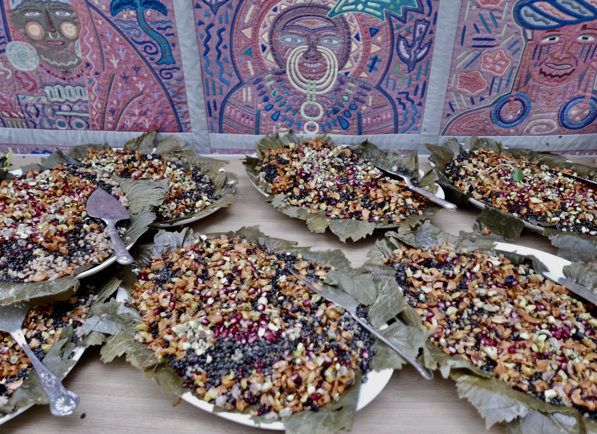 Our Autumnal feast began with an opening candle-lighting ritual, and the divine music of the Dilruba, a sacred Sikh devotional instrument, played for us by Jatinder Singh Durhailey. Our playfully constructed canapés were served to guests, comprised partly from surplus waste from the season, donated by the Refettorio Felix Project. While enjoying their starters, guests were guided in a creative practice to connect with the autumn time, creating some playful ‘Kigo’ poetry (Japanese inspired seasonal poetry) in pairs.