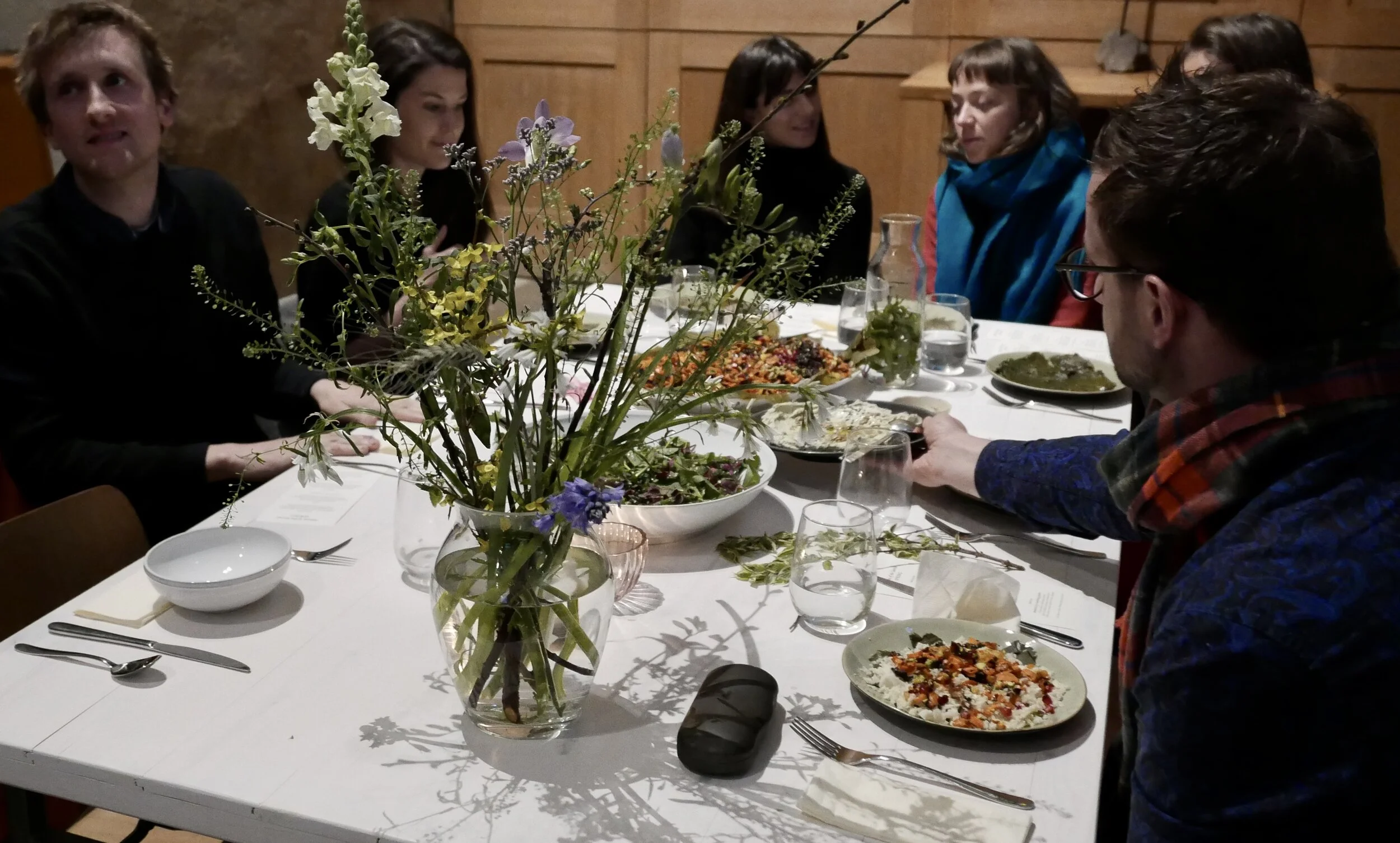 We began the final winter celebration with our traditional candle-lighting opening ritual and moment for prayer. In many myths and folktales, winter is a descent into the underworld; relating to the spiritual world, and to meeting our real spiritual selves. Over starters, guests were invited to read and contemplate together the profound poem ‘A Vast Plain’, by Rainer Maria Rilke.